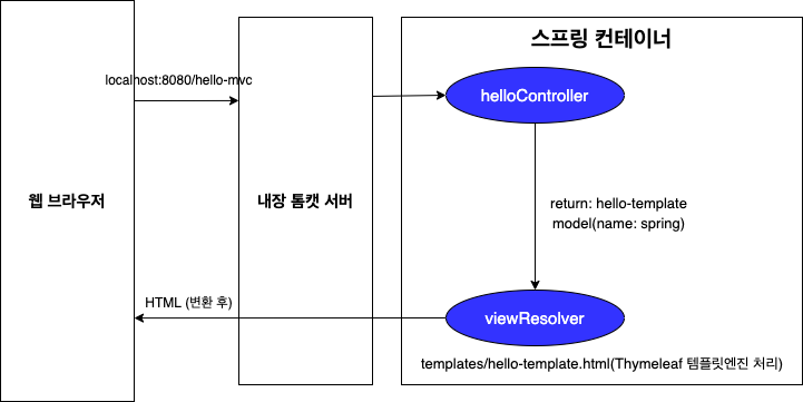 - url에서 받아온 name에 대한 "spring" 이라는 값이 public Stirng helloMvc 의 String name 에 담기고,