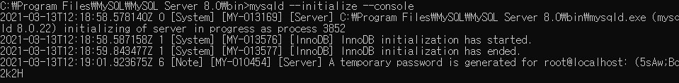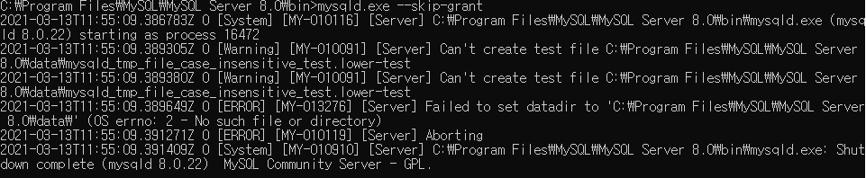 이제 다시 mysqld.exe --skip-grant-tables --console --shared-memory를 입력하면, 제대로 실행되는 것을 볼 수 있다.